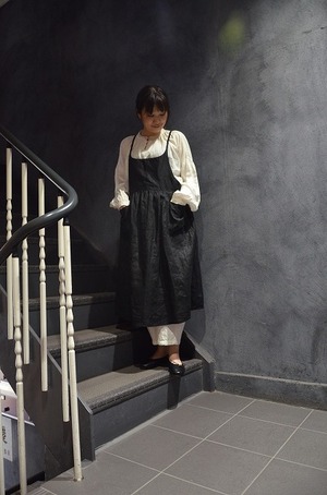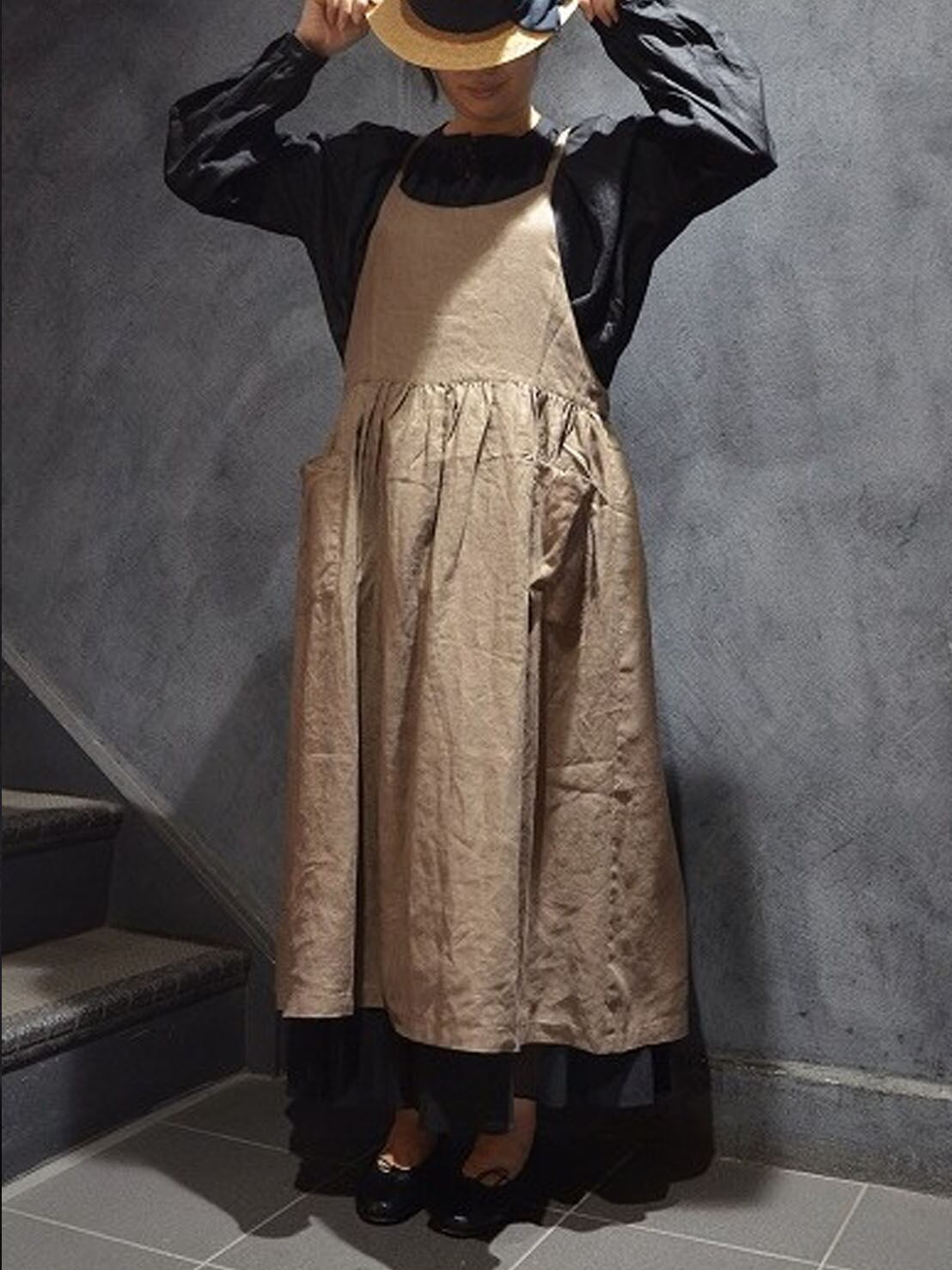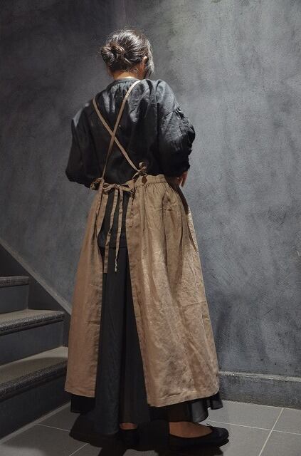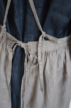 スカート部分に細かいギャザーを施したキャミソールワンピースタイプのエプロンです。